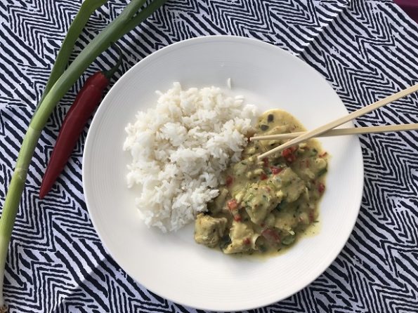 Kip siam met broccoli, paprika, lente-ui en cashewnoten