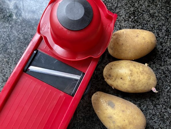 - Snijd de aardappels met de mandoline (of kaasschaaf) zo dun mogelijk.