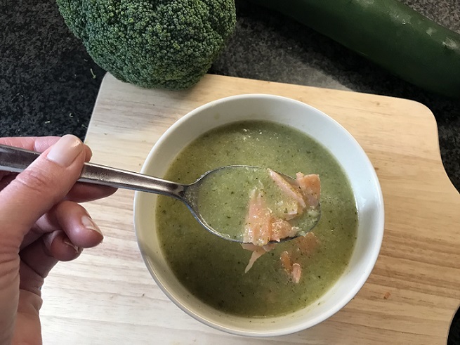 - Serveer de broccoli-courgette soep in een soepkom of een diep bord. Verdeel als laatste de zalmsnippers over de kommen.