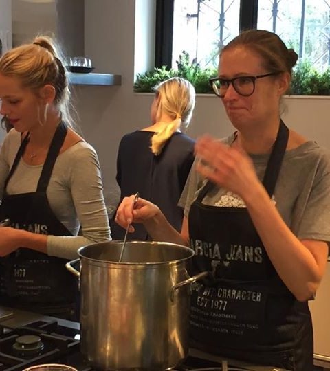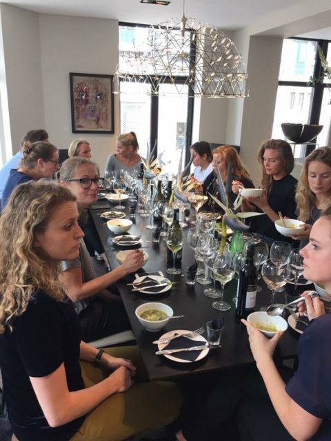 Maar dat maakte het juist des te leuker. We hadden samen met Kim, Bénine, Ruby, Ellen van Kosmos Uitgeverij, het andere duo (sorry ik ben de namen vergeten), Daniëlle en ik de keuken voor ons zelf wat echt super gezellig was. We hadden per duo een recept uit het boek gekregen wat we gingen maken. Daniëlle en ik hadden gekozen voor de courgette munt soep. Verder werden uit het boek de panzanella gemaakt, de flammkuchen met geitenkaas en gekaramelliseerde ui, de clafoutis met frambozen en de pompoen risotto met gekaramelliseerde wortel.