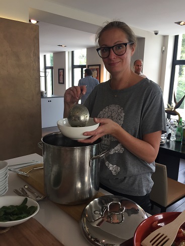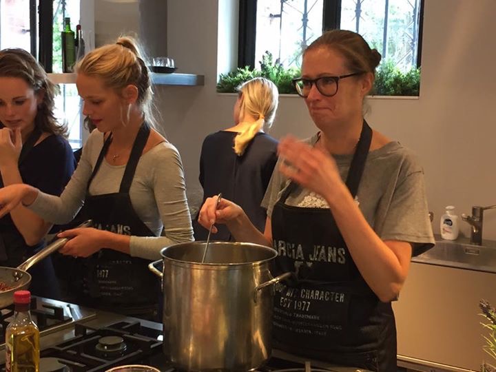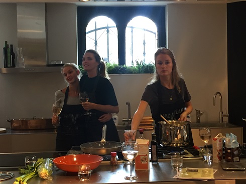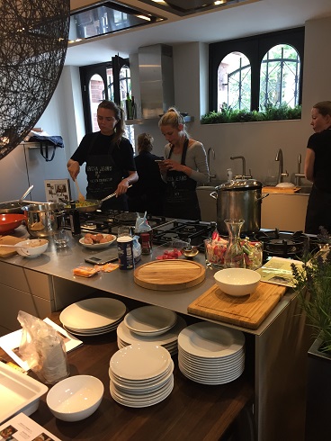 Maar dat maakte het juist des te leuker. We hadden samen met Kim, Bénine, Ruby, Ellen van Kosmos Uitgeverij, het andere duo (sorry ik ben de namen vergeten), Daniëlle en ik de keuken voor ons zelf wat echt super gezellig was. We hadden per duo een recept uit het boek gekregen wat we gingen maken. Daniëlle en ik hadden gekozen voor de courgette munt soep. Verder werden uit het boek de panzanella gemaakt, de flammkuchen met geitenkaas en gekaramelliseerde ui, de clafoutis met frambozen en de pompoen risotto met gekaramelliseerde wortel.