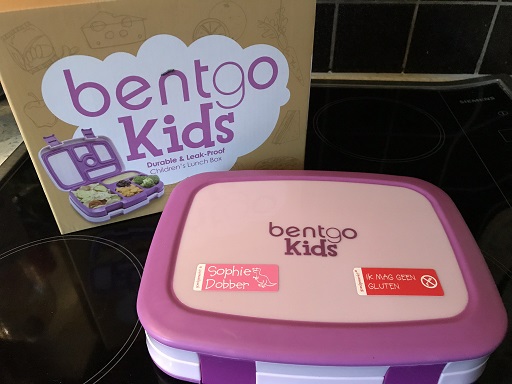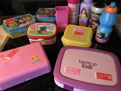 We hebben een leuke broodtrommel met verschillende vakjes voor haar gekocht en wat hippe bekers. Online via goedgemerkt hebben we speciale naamstickers laten maken en hebben daar direct ook rode stickers met de tekst “Ik mag geen gluten” besteld. Deze stickers hebben we op al haar trommeltjes en bekers geplakt. De stickers zijn bestendig tegen de vaatwasser en de magnetron, dus je hoeft ze maar eenmalig te plakken.