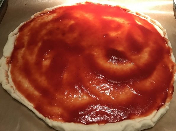 - Schep 2 tot 3 grote sauslepels met tomatensaus op de pizza. Verdeel de saus met de bolle kant van de sauslepel over de pizza.