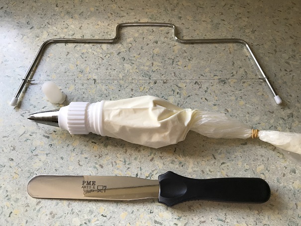 Als het biscuit afgekoeld is, dan kan je deze door gaan snijden. Snijd het biscuit in 3 gelijke delen met een taartzaag of broodmes. Voordat je de lagen van elkaar haalt, steek in elke laag een cocktailprikker. Op deze manier kan je de taart na het vullen weer recht op elkaar zetten door de cocktailprikkers in een lijn te houden.