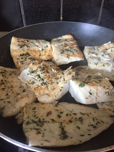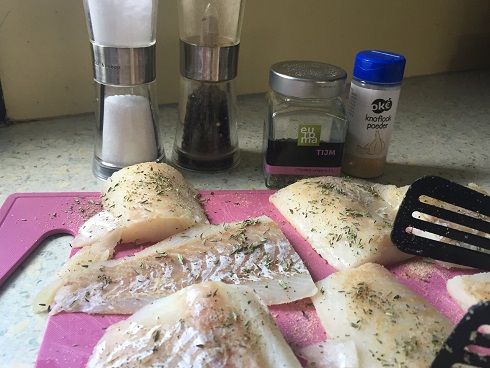 - Dep de kabeljauw helemaal droog en bestrooi deze met wat knoflookpoeder, verse tijm, peper en zout.