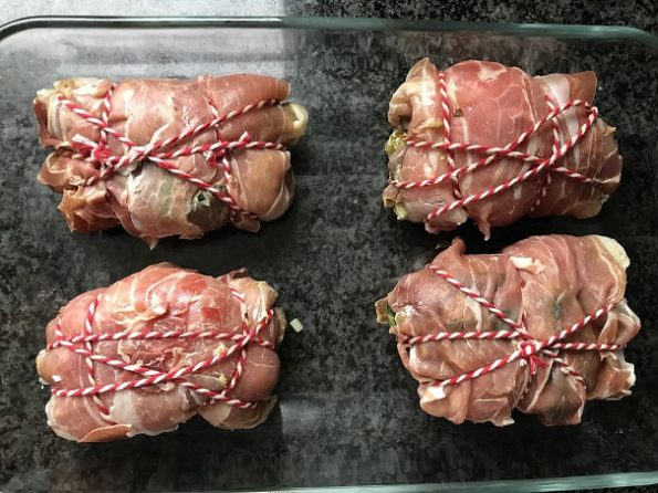- Rol de kalkoenlapjes voorzichtig en zo strak mogelijk op en omwikkel ze met de parmaham.
