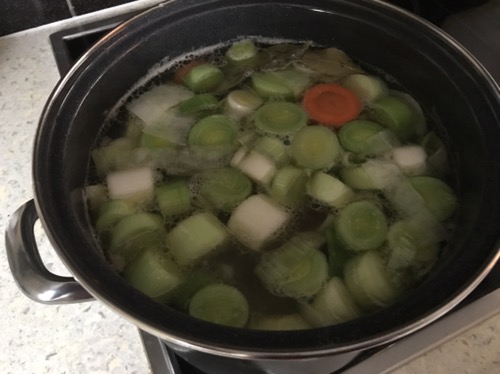 - Voeg nu de winterpenen, uien, prei, bleekselderij en laurier toe. Breng alles weer aan de kook. Doe de deksel op de pan en zet het vuur laag zodat het geheel heel zachtjes kookt.