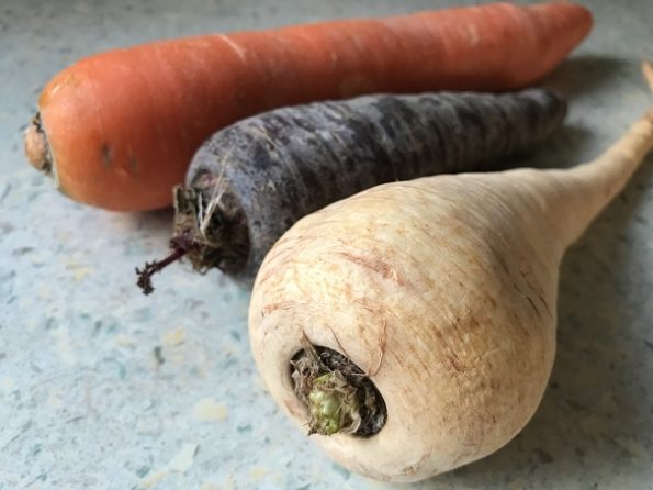- Schil de pastinaak, paarse wortel en winterpeen. Snijd deze in plakjes
