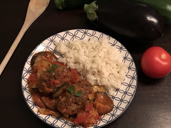 Een heerlijk Grieks gerecht met kruidige gehaktrolletjes in tomatensaus met courgette en aubergine. Lekker met witte rijst en wat salade.