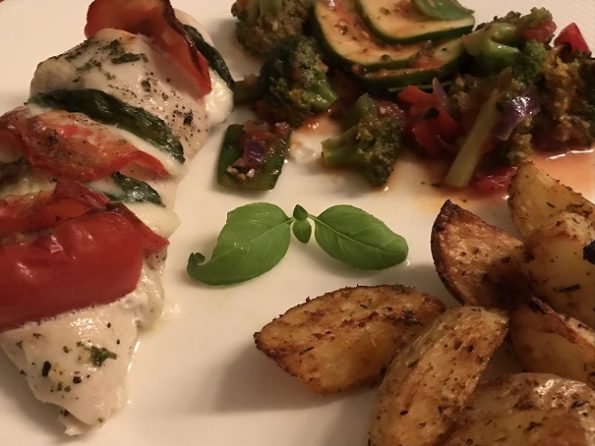 Kip caprese. Een heerlijk Italiaans kipgerecht uit oven met tomaat, basilicum en mozzarella. Lekker met aardappeltjes of pasta en Mediterraanse groenten.