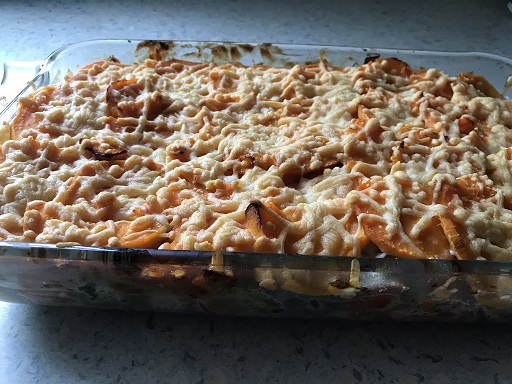Ovenschotel met zalm, groene groente en zoete aardappel