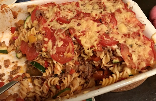 Een mega lekkere en makkelijke pasta ovenschotel met courgette, gehakt en tomaat.