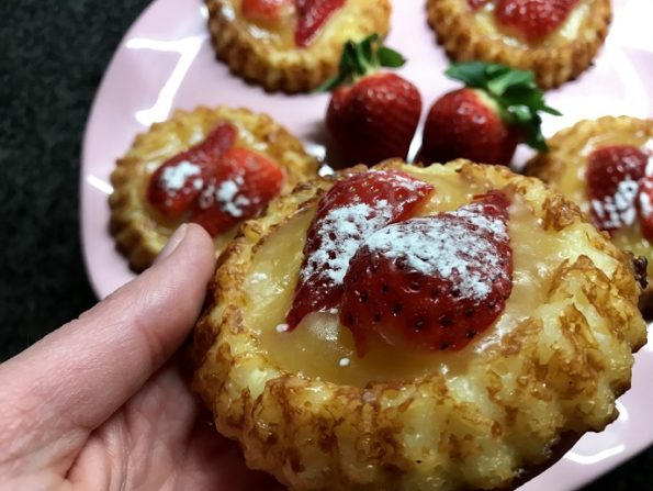 Zoete rijstgebakjes met aardbeien en lemon curd